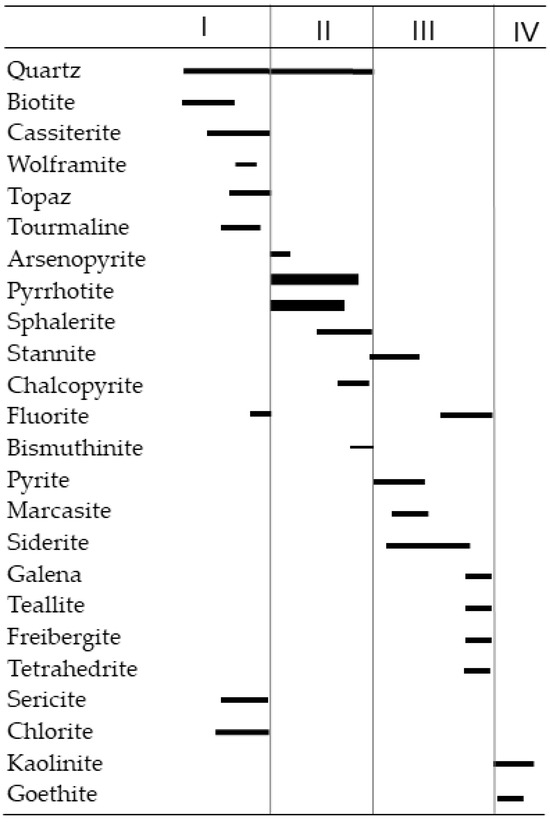 Paragenetic sequence of the Colquiri mineralization (modified from [32,34]).