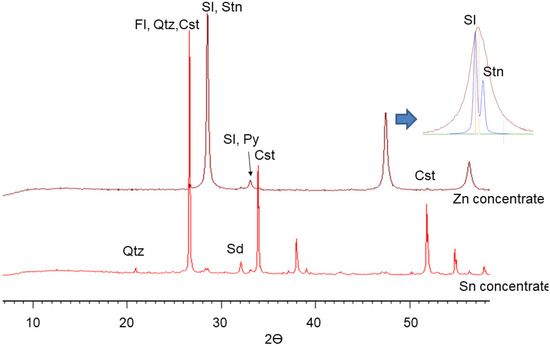 Mineralogy of concentrates and tailings was determined via XRD, and samples were observed in thick sections via optical microscopy, SEM, and XRD. According to the XRD diffractograms (Figure 6), the Zn concentrate consists of 65 wt.% sphalerite, 2.5 wt.% stannite, and 1.3 wt.% cassiterite, with a minor amount of quartz. The Sn concentrate has slightly more than 50 wt.% cassiterite and about 20 wt.% of quartz. The stannite content is negligible, but it contains sphalerite, siderite, and minor amounts of pyrite and fluorite.