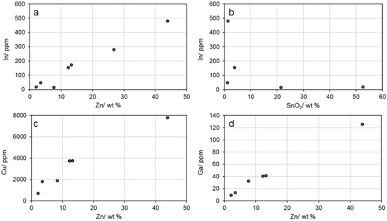 Correlation between metal contents in materials from Colquiri: (a) Zn and In; (b) SnO2 and In; (c) Zn and Cu; (d) Zn and Ga.
