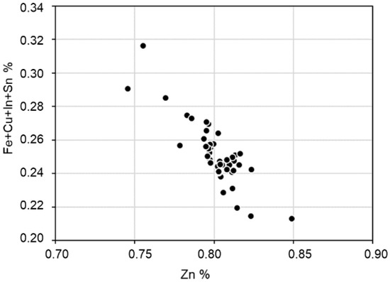 There is a good correlation between Cu + Fe + Sn + In with Zn, except in the case of Ag-rich stannite (Figure 9b). This correlation has been considered to be the result of the existence of a solid solution between stannite and sphalerite [50]. The indium content is similar to that of sphalerite, up to 0.26 wt.%