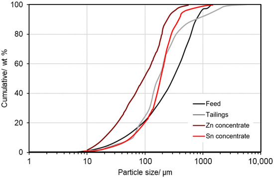 Particle size is a fundamental parameter for achieving both high ore recovery and high-grade materials. The particle sizes of the feed, concentrates, and tailings from the Colquiri plant are shown in Figure 10. The particle size of the feeding plant material, after the first grinding stage, reaches a P80 of 624 µm. The cassiterite concentrate has a P80 of 300 µm, while the sphalerite concentrate may be of this size or smaller, depending on the flow diagram trajectory from which it originates (see Figure 3), reaching a P80 of about 200 µm. The final tailings contain material provided from different stages of the plant’s flow diagram, resulting in a particle size with a P80 of 380 µm.