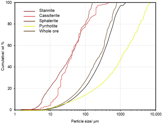 To evaluate whether the final grinding has achieved the appropriate sizes so that the ore can be properly separated at the processing plant, the grain size of each type of mineral must be examined. This information is provided via MLA/AMICS. Based on the MLA results, the grain size distribution of the ores—sphalerite, stannite, and cassiterite—has been determined. Pyrrhotite, which is the most abundant mineral, exhibits a grain size with a P80 of 502 µm (Figure 11). Sphalerite has a finer grain size than the particle size of the overall run-of-mine material, with a P80 of 460 µm, while stannite and cassiterite are significantly finer, with P80 values of 108 µm and 120 µm, respectively.