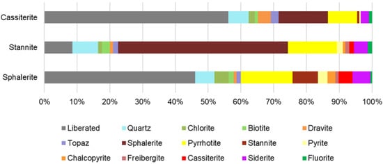 The liberation and the association among minerals could be established using the MLA and AMICS. The total number of particles analyzed in the sample of the run-of-mine material was 70,944, and the number of grains was 190,795. Of these, there are 7724 grains of sphalerite, 2716 of stannite, and 1284 of cassiterite. The liberation characteristics and mineral association of the non-liberated particles of ores (locked in other minerals) from Colquiri are shown in Table 4.