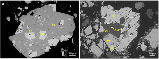 The Colquiri deposit is composed mainly of sulfides and oxides, with sulfides being more common in the upper parts of the deposit, while the ratio of oxides increases with depth. The main ore minerals include pyrrhotite, sphalerite, pyrite, stannite, and cassiterite (Figure 4).