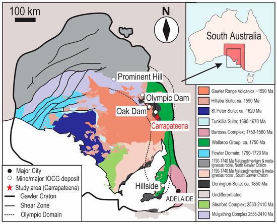 Geological map showing location of Carrapateena and selected deposits in the Olympic Domain of South Australia (modified from [22]).
