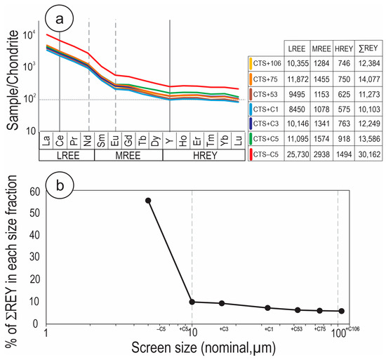 (a) Chondrite-normalized REE fractionation trends and data summary for different size fractions of Carrapateena mine tailings. Chondrite values taken from [33]. LREE: La, Ce, Pr and Nd; MREE: Sm, Eu, Gd, Tb, and Dy; HREE: Ho, Er, Tm, Yb, Lu and Y. (b) Partitioning of ΣREY across the size fractions.