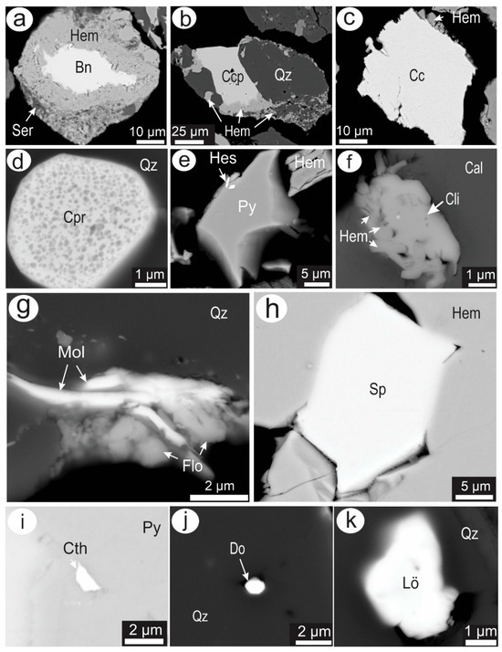 BSE images showing residual ore minerals in mine tailings. (a) Grain of bornite (Bn) locked within fine-grained hematite (Hem). (b) Grain of chalcopyrite (Ccp) locked within an association of quartz (Qz) and hematite. (c) Liberated grain of chalcocite (Cc) associated with minor hematite on particle margin. (d) Tiny inclusion of cuprite (Cpr) within quartz. (e) Liberated grain of pyrite (Py) hosts tiny inclusions of hessite (Hes). (f) Carrollite (Cli) grain embedded within calcite (Cal) and surrounded by hematite. (g) Micro-veinlet of molybdenite (Mol) associated with florencite (Flo) within quartz. (h) Fine inclusion of sphalerite (Sp) within hematite. (i) Tiny inclusion of clausthalite (Cth) within pyrite. (j) Tiny inclusion of domeykite (Do) within quartz. (k) Grain of löllingite (Lö) within quartz.