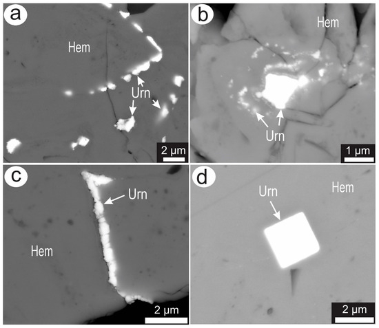 BSE images showing the distribution of uraninite (Urn) within hematite. (a,b) Dense concentrations of uraninite within hematite (Hem). (c) Uraninite micro-veinlet within hematite. (d) Micro-inclusion of uraninite with cubic cross-section within hematite.