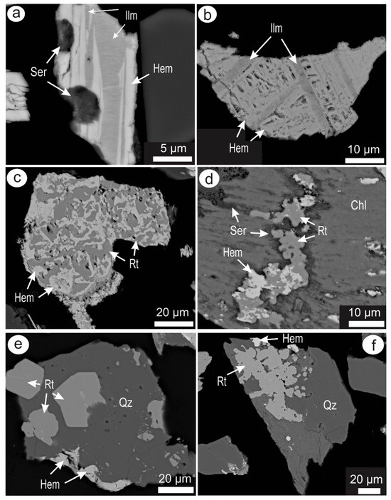 BSE images illustrating aspects of Fe-Ti-minerals in different size fractions. (a) Ilmenite (Ilm) bands within hematite (Hem)-sericite (Ser). (b) Ilmenite bands within hematite. (c) Symplectite texture of rutile (Rt) occurring with hematite. (d) Rutile-hematite replacement enclosed within chlorite (Chl)-sericite intergrowth. (e,f) Rutile-bearing quartz (Qz).