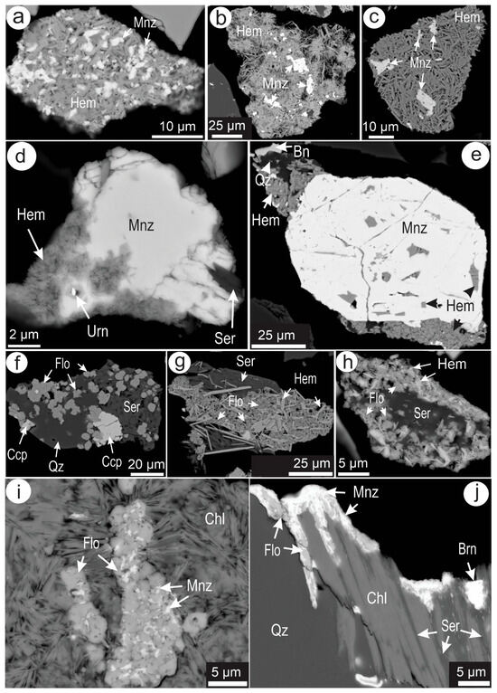 BSE images illustrating different morphologies and associations of monazite (Mnz), various textures exhibited by florencite (Flo), and replacement relationships between the two minerals. (a–c) Monazite disseminations within acicular hematite (Hem). (d) Monazite associated with hematite and sericite (Ser). (e) Fractured monazite associated with hematite. (f) Disseminated florencite in quartz (Qz)-sericite (Ser) association. (g,h) Massive micro-agglomeration of florencite within sericite–hematite association. (i) Florencite replacing monazite within chlorite (Chl). (j) Monazite replaced by florencite within Qz-Ser association with a small grain of brannerite (Brn).