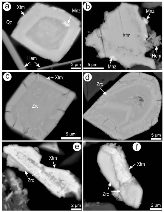 BSE images illustrating various examples of xenotime (Xtm) and zircon (Zrc) and evidence of replacement between the two minerals. (a) Xenotime grain locked within quartz (Qz) and associated with fine-grained needle-like hematite (Hem). (b) Fractured liberated xenotime grain associated with hematite. (c,d) Liberated fine-grained zircon. (e,f) Relict zircon preserved in xenotime.