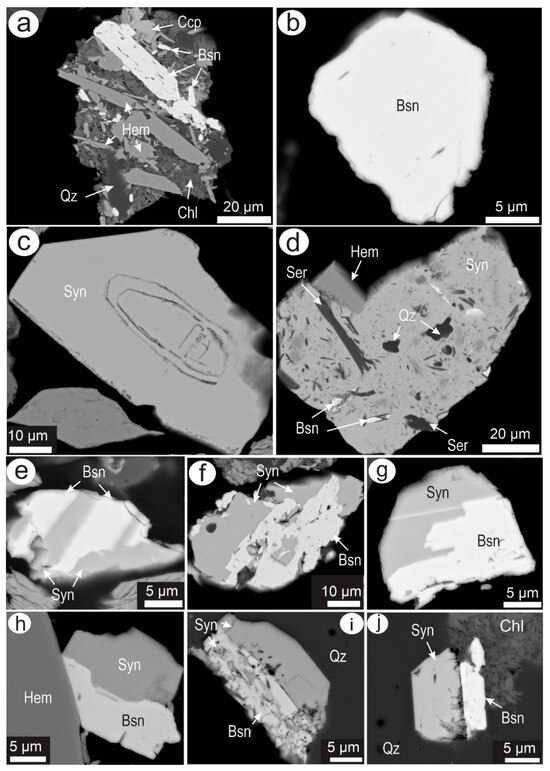 BSE images showing various shapes and associated gangue minerals with bastnäsite (Bsn) and synchysite (Syn) and characteristic intergrowth between the two fluorocarbonates. (a) Composite particle comprising prismatic bastnäsite enclosed within hematite (Hem), sericite (Ser) and quartz (Qz). (b) Liberated bastnäsite. (c,d) Liberated synchysite grains. (e–j) Characteristic intergrowths between bastnäsite and synchysite.