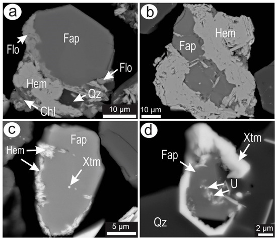 BSE images showing aspects of fluorapatite (Fap). (a) Fluorapatite intergrowths with florencite (Flo) within composite particle of hematite (Hem), chlorite (Chl), and quartz (Qz). (b) Fluorapatite locked within hematite. (c) Liberated fluorapatite grain hosting inclusions of xenotime (Xtm). (d) Xenotime as a rim, ~1 µm wide, on fluorapatite and locked within quartz. Sub-micron-sized U-bearing inclusions (probably uraninite) are hosted within fluorapatite.