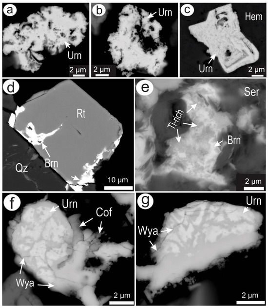 BSE images illustrating uranium minerals. (a,b) Irregular-shaped liberated particles of uraninite (Urn) displaying corroded (leached?) margins. (c) Inclusion of fine-grained subhedral, compositionally zoned uraninite within hematite (Hem). (d) Replacement of rutile (Rt) by brannerite (Brn) along grain margins and following fractures. Qz: quartz. (e) Brannerite intergrown with fine-grained sericite (Ser); zones with darker grey color are Ti-rich and likely correspond to decomposed rutile. (f,g) Characteristic intergrowths between relict uraninite and replacive wyartite (Wya). Minor coffinite (Cof) is noted on the outer rim of the particle.