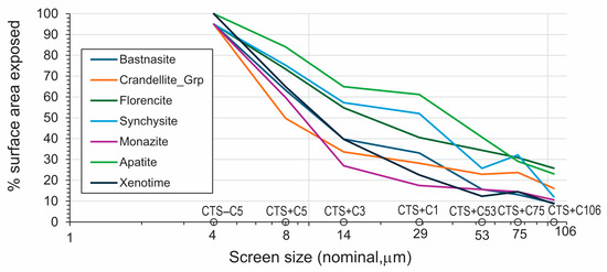 The relative abundance of monazite and florencite, followed by xenotime, relative to other REE-mineral species is in sharp contrast to the Olympic Dam orebody, in which bastnäsite is the dominant REE host [28,49,50]. In the Carrapateena tailings, both phosphates show variation in grain size and morphology. A plot of % surface area exposed vs. particle size (Figure 13) reveals differences in distribution between the REE-fluorocarbonates and florencite, which are more likely to be liberated, and the finer, less exposed monazite and xenotime. Although a small number of relatively larger liberated grains are observed in the coarser fractions, monazite and florencite are dominantly <5 μm in size and are thus heavily concentrated in the finest fractions (Figure 3b).