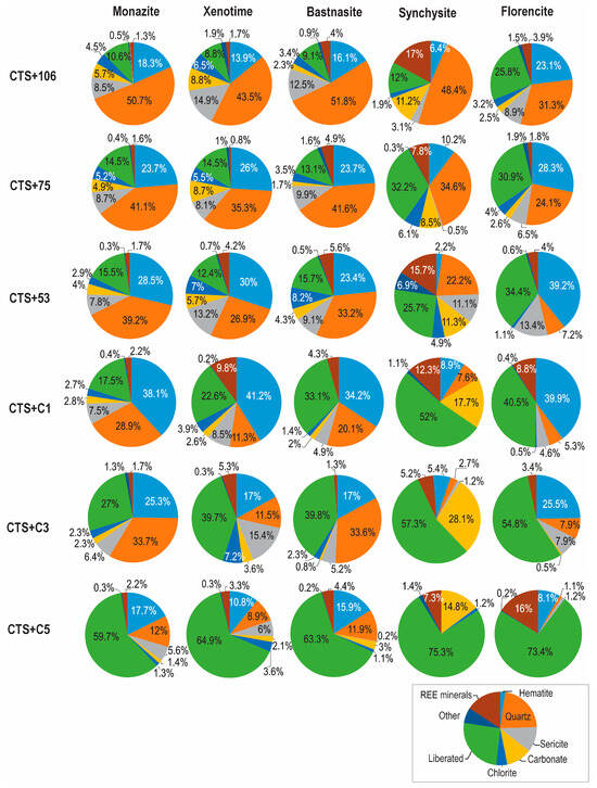Quantitative modal mineralogy indicates that all six size fractions are dominated by gangue minerals (Table 2). Iron oxides are the most abundant, with their abundances increasing significantly from the coarsest to the finest fractions, reaching up to 81 wt.% in the CTS+C1 fraction. Quartz is the second most abundant gangue mineral and has a greater abundance in the coarser fractions and lower in the CTS+C1 fraction. All REE-bearing minerals are most abundant in the finest fraction, particularly in CTS+C5.