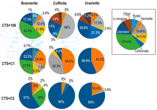 Uranium minerals, specifically uraninite and wyartite, occur in other forms as mixtures with hematite. These mineral mixtures are consistently observed across a wide range of grain-size fractions, including both the coarsest (Figure 12b,c) and finest (Figure 12d) fractions. The ultrafine-grained mixtures may reflect complex alteration processes, late-stage precipitation events involving both uranium and iron oxides [39], or simply the recrystallization of hematite, which initially contained U within its lattice [36].