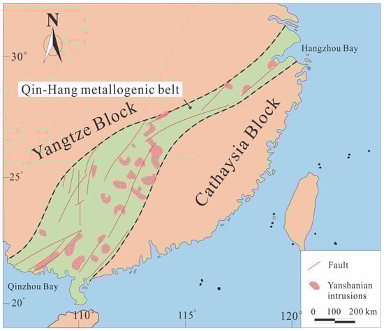 To facilitate a better understanding of the spatial and structural characteristics of the Qin–Hang metallogenic belt, a simplified geological map illustrating the regional tectonic framework, major faults, and Yanshanian magmatic intrusions is provided in Figure 1.
