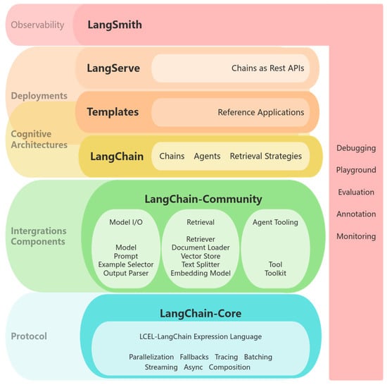 LangChain is an open-source framework designed to facilitate the development of applications based on large language models (LLMs). Key features include chain-based task execution, intelligent agents, memory mechanisms, prompt templates, and integration with external tools. These features work together to enable developers to rapidly build complex automated systems and versatile applications such as intelligent dialog systems, Q&A platforms, and information retrieval tools. As shown in Figure 2, the LangChain framework is structured into five layers: observability, deployments, cognitive architectures, integration components, and protocols. Each layer serves a distinct role in simplifying and supporting the development, integration, and deployment of LLM applications [90]. A detailed overview of each layer follows: