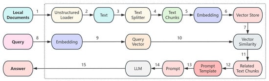 Retrieval-augmented generation (RAG) technology combines information retrieval with generative language models, enabling dialog systems to dynamically access external knowledge to generate more accurate and contextually relevant responses. Leveraging the LangChain framework, RAG facilitates the development of efficient and reliable Q&A systems by loading and processing local knowledge bases. The key steps are as follows (Figure 3) [92]: