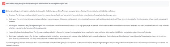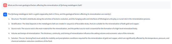 The ChatGLM3-6B RAG-based intelligent conversational knowledge base clearly demonstrates an advantage in professional expertise when generating responses related to the Qin–Hang metallogenic belt, as shown in Figure 3. It provides specialized terminology and detailed perspectives on the belt’s structural characteristics, rock types, and mineralization conditions. For example, it highlights the significance of the uplifted and folded zones within the belt, which are critical structural features linked to favorable geological conditions for mineralization. Additionally, ChatGLM3-6B lists the main rock types essential for understanding the belt’s foundational geology, offering a focused approach that presents concise, relevant information for users with some background knowledge in the field.