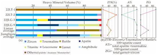 Heavy minerals in Jiangligou sandstone samples are dominated by stable minerals and highly stable types (22JLG-3, 22JLG-9), with minor unstable (22JLG-9) and moderately stable (22JLG-9). Samples have similar low ZTR, high ATi, and low GZi indices (Figure 4b) and high unstable mineral content, dominated by intermediate-acidic igneous rocks, with minor input from medium–low-grade metamorphic rocks.