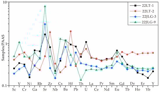 Most trace elements are lower than PAAS [21]. Some samples show slightly higher concentrations of High-Field-Strength Elements (Zr in 22LT-2, Hf in 22LT-2, U in 22LT-1), Low-Field-Strength Elements (Sr in 22LT-1, 22JLG-3, 22JLG-9; Ba in 22LT-1, 22JLG-9), and V and Cs in 22JLG-9 (Figure 5 and Table 1). Ratios of La/Sc (1.17–4.29, avg. 2.94), Th/Sc (0.25–1.71, avg. 1.20), and Cr/Th (3.82–20.94, avg. 8.99) are significantly higher than those typical of sandstones derived from mafic sources (La/Sc = 0.04–0.09, Th/Sc = 0.005–0.006, Cr/Th = 1.10–1.15 [21]).