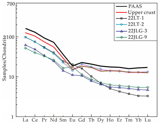 Total rare earth element (REE) contents are low to moderate (62.79 × 10−6–111.56 × 10−6), lower than PAAS (242.9 × 10−6) [21] and UCC (146.37 × 10−6) [22]. High ΣLREE/ΣHREE ratios (6.54–13.62, avg. 9.47) indicate light REE enrichment. Strong LREE-HREE fractionation is observed ((La/Yb)N = 7.61–29.50, avg. 14.96). Most samples show moderate negative Eu anomalies (22LT-2, 22JLG-3; δEu = 0.66, 0.89). One sample shows a positive Eu anomaly (22JLG-9, δEu = 1.29) and one shows no anomaly (22LT-1, δEu = 1.00). Ce anomalies are negligible (δCe = 0.94–1.01, avg. 0.98). Most samples (22LT-2, 22JLG-3) exhibit right-sloping REE patterns with moderate negative Eu anomalies (Figure 6 and Table 1).