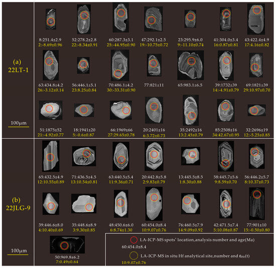 Cathodoluminescence images (CL) of zircon grains from the 22LT-1 (a) and 22JLG-9 (b) samples.
