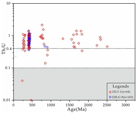 Detrital zircon U-Pb dating was performed on samples 22LT-1 (Lintan) and 22JLG-9 (Jiangligou). Data are presented in Supplementary Table S1. Most zircons are euhedral prisms, 80–150 μm long and 50–80 μm wide, with aspect ratios of 1:1 to 2.5:1 (Figure 7). CL images reveal oscillatory zoning typical of magmatic origin in most grains (Figure 7). Th/U ratios are mostly >0.4 (Figure 8), confirming magmatic origin. Some zircons display sector zoning, with Th/U < 0.1, indicating metamorphic origin [24,25,26]. A few grains show both features, suggesting modification of magmatic zircons by later metamorphism.