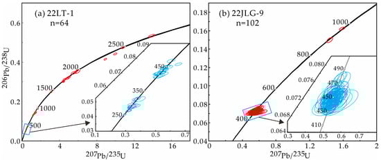 U-Pb concordia diagrams of detrital zircons (a) 22LT-1, (b) 22JLG-9. Errors are quoted at the 1σ level. The red ellipses represent the data of the complete harmonious ages of the samples, while the blue ellipses represent the data of younger ages (<500 Ma) of the samples.