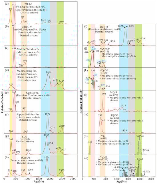 Contrasting relative probability plots of zircon U-Pb ages. Only those ages with a discordance of less than 10% are used. The yellow, pink, orangered, blue, grey, and green bars show the age groups of 350–250 Ma, 550–350 Ma, 1000–750 Ma, 2000–1600 Ma, 2300–2000 Ma, and 2600–2300 Ma, respectively. Data sources: (a,b) The 22LT-1 (a) and 22JLG-9 (b) data are from this study; (c) the detrital zircon ages of the Middle Shilidun Fm. (Middle-Late Permian, Minxian area) are from Chang, 2019 [10]; (d) the detrital zircon ages of the Maomaolong Fm. (Middle Permian, Hezuo area) are from Zhang et al., 2014 [9]; (e) the detrital zircon ages of the Ganjia Fm. (Permian, Xunhua area) are from Yan, 2017 [8]; (f) the detrital zircon ages of the Upper Shilidun Fm. (Middle-Late Permian, Lintan area) are from Gao et al., 2019 [5]; (g,i) the detrital zircon ages of the Southern Ordos Basin (SOB, (g)) and QinOB (i) are from Pan et al., 2024 [14] and the references therein; (h) the detrital zircon ages of the southern Qinling Orogenic Belt (SQinOB) are from Duan et al., 2025 [27] and the references therein; (j,k,n,o) the magmatic zircon and metamorphic zircon ages of the NQinOB (j), NQiOB (k), Yinshan Block (YB, (n)), and North China Craton basement (NCCB, (o)) are from Pan et al., 2024 [14] and the references therein. (l,m) the magmatic zircon and metamorphic zircon ages of the Middle Qilian Block (MQiB, (l)) and southern Qinling Orogenic Belt (SQiOB, (m)) are from Ji et al., 2021 [28] and the references therein. The relative probability curves were drawn with the DensityPlotter program (version 8.5), using the kernel density estimation model (KED). The width of one column in Figure 10n,o is 25 Ma.