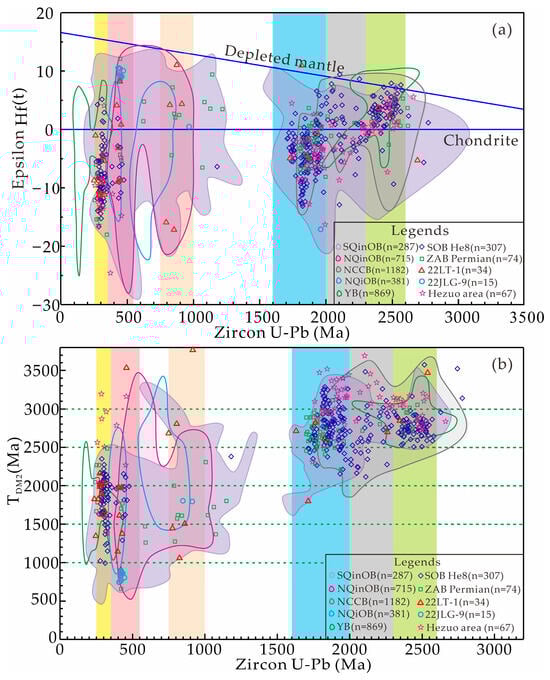 εHf(t) values vs. U-Pb ages (a) and TDM2 values vs. U-Pb ages (b). The yellow, pink, orange-red, blue, grey, and green bars show the age groups of 350–250 Ma, 550–350 Ma, 1000–750 Ma, 2000–1600 Ma, 2300–2000 Ma, and 2600–2300 Ma, respectively. Data sources: The 22LT-1 and 22JLG-9 data are from this study; the detrital zircon ages of the SOB are from Pan et al., 2024 [14] and the references therein; the SQinOB are from Duan et al., 2025 [27] and the references therein; the detrital zircon ages of Maomaolong Fm. (Middle Permian, Hezuo area) are from Zhang et al., 2014 [9]; the data of the NQinOB, NCCB, NQiOB, and Yinshan Block (YB) are from Pan et al., 2024 [14] and the references therein. Data on depleted mantle are from Griffin et al., 2000 [29].
