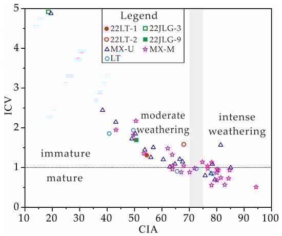 The CIA–ICV index diagram of the study area. The base map is according to Nesbitt and Young, 1982 [30] and Cox et al., 1995 [31]. Data sources: The MX-U (Upper Shilidun Fm., Middle-Late Permian, Minxian area) and MX-M (Middle Shilidun Fm., Middle-Late Permian, Minxian area) data are from Chang, 2019 [10]; the LT (Shilidun Fm., Lintan area) are from Feng et al., 2023 [7].