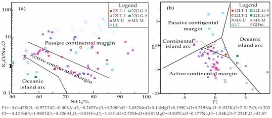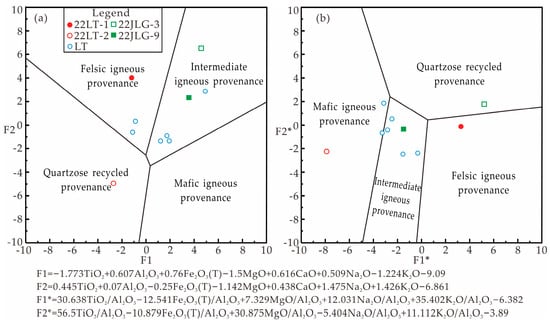 Provenance discrimination plot for the major element compositions of samples. (a) F1–F2 discriminant diagram for rock provenance classification, (b) F1*–F2* discriminant diagram for rock provenance classification; the base maps are according to Roser and Korsch, 1988 [32]. Data sources: the LT (Shilidun Fm., Lintan area) data are from Feng et al., 2023 [7].