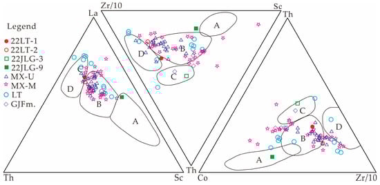 Tectonic setting discrimination diagrams (La-Th-Sc, Th-Sc-Zr/10 and Th-Co-Zr/10) for the provenance analysis of the sandstone samples. A: Oceanic island arc. B: Continental island arc. C: Active continental margin. D: Passive continental margin. The base maps are according to Bhatia and Crook, 1986 [35]. Data sources: The 22LT-1, 22LT-2, 22JLG-3 and 22JLG-9 data are from this study; the GJFm. (Ganjia Fm., Permian, Xunhua area) data are from Yan, 2017 [8]; the MX-U (Upper Shilidun Fm., Middle-Late Permian, Minxian area) and MX-M (Middle Shilidun Fm., Middle-Late Permian, Minxian area) data are from Chang, 2019 [10]; the LT (Shilidun Fm., Lintan area) are from Feng et al., 2023 [7].