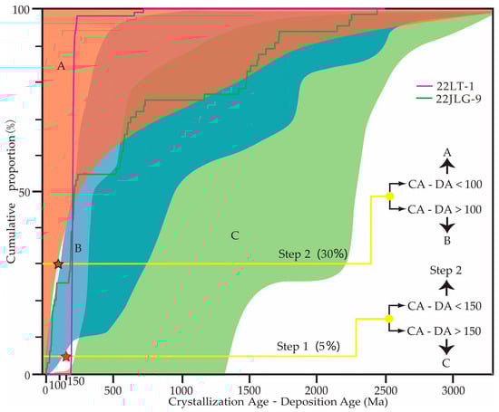 CA-DA cumulative age distribution plot of detrital zircon samples from the study area (the base map is according to Cawood et al., 2012 [36]. Area A (orange region) represents the convergent environment, Area B (blue region) represents the colliding environment, and Area C (green region) represents the divergent environment.
