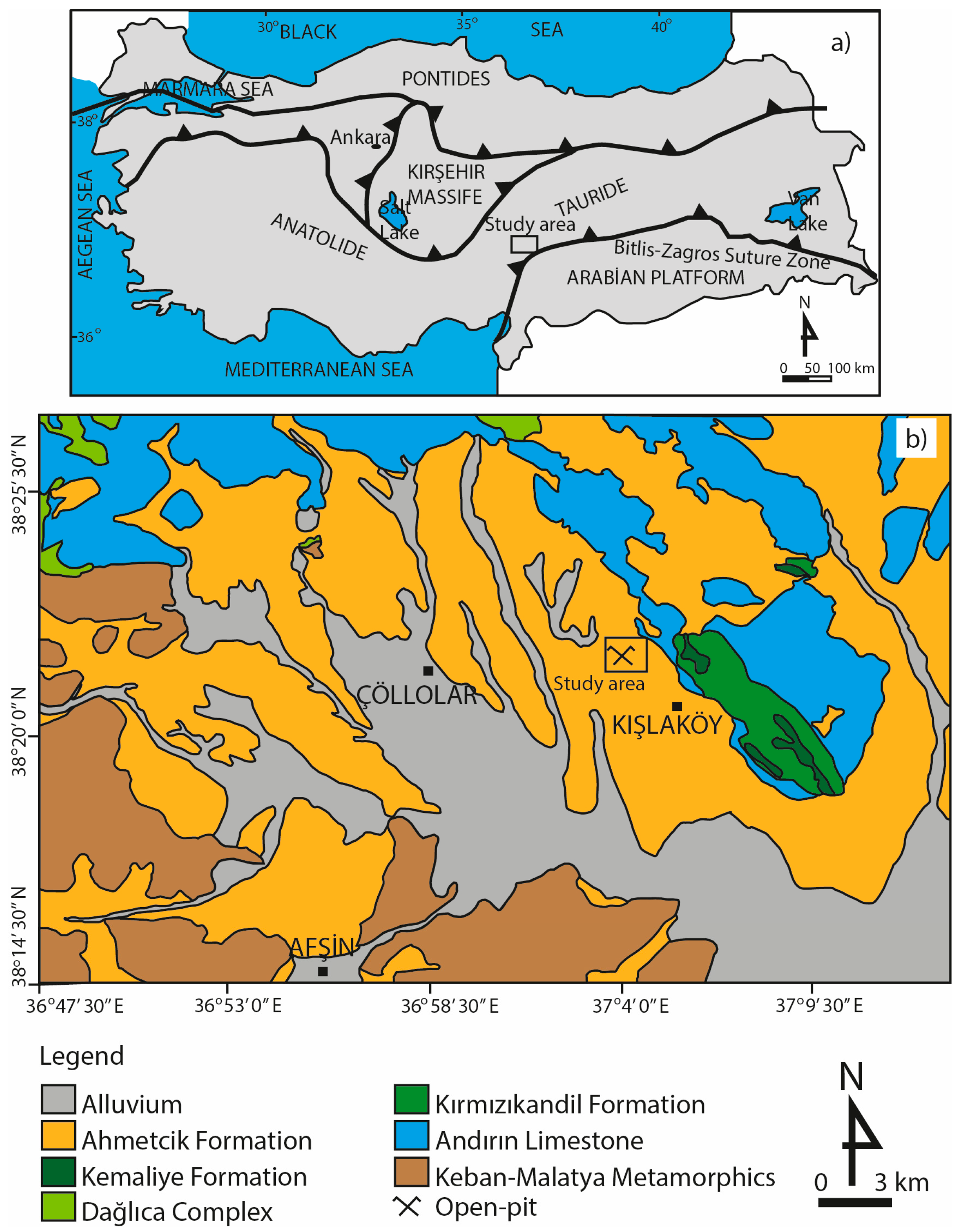 - Yılmaz, A.; Bedi, Y.; Uysal, Ş.; Aydın, N. 1:100,000 Scaled Geologic Maps of Turkey, Elbistan-I23 Quadrangle; No: 50; MTA, Department of Geological Research: Ankara, Turkey, 1997.