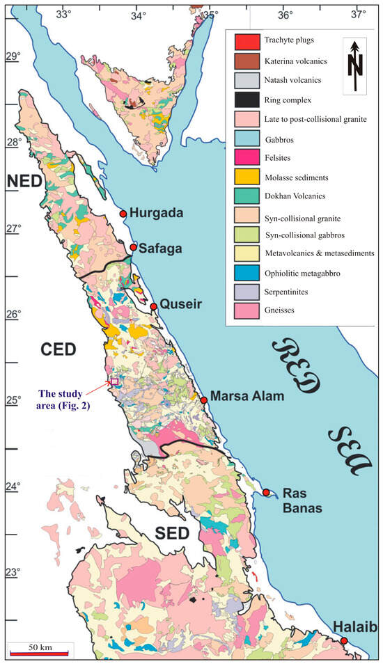 Geologic map of the Egyptian Nubian Shield showing three lithotectonic domains in the Eastern Desert of Egypt (Southern Eastern Desert (SED), Central Eastern Desert (CED), and Northern Eastern Desert (NED)) [35], with the location of the study area indicated. All units, except the tertiary trachyte plugs, are late Neoproterozoic in age.