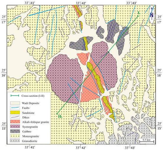 Detailed geologic map of the Gabal El-Bakriya area [22]. Location of the I-II cross-section (Figure 3) is indicated.