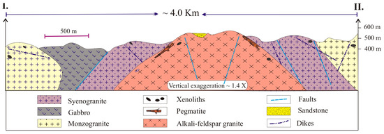 The granitoids of the Gabal El-Bakriya can be broadly categorized into syn-collisional and post-collisional varieties. The syn-collisional assemblage comprises diorite to granodiorite, whereas the post-collisional suite includes calc-alkaline monzogranite and A-type granites. The latter defines the GEBI, forming a ring complex with an inner core of alkali-feldspar granite and an outer rim of syenogranite. Although geochronological data are not available for the GEBI, relative age relationships among the rock units have been established from crosscutting relationships and are shown in the geological cross-section (Figure 3).
