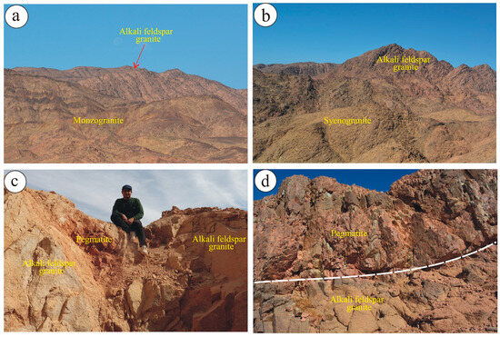 Field photographs show (a) sharp contact between alkali-feldspar granite and monzogranite; Note: dikes traversing the monzogranite and abutting the alkali-feldspar granite, (b) alkali-feldspar granite with pinkish color intruding syenogranite with yellowish color, (c) highly tectonized alkali-feldspar granite dissected by pegmatite and quartz veins, (d) granitic pegmatite dike.
