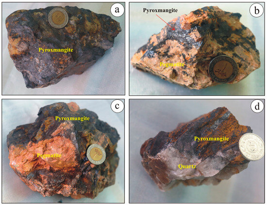 Hand specimen samples showing (a) massive pyroxmangite, (b) disseminated pyroxmangite in pegmatite, (c) inclusion of pegmatite in pyroxmangite, and (d) inclusion of quartz in pyroxmangite.