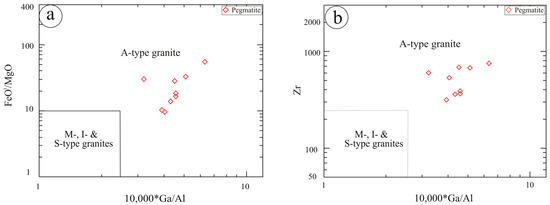 Other key geochemical features consistent with A-type granites include high Ga/Al, Nb, Zr, Y, Ta, and Th, along with depletion in MgO, CaO, and P2O5 [61,62,63,64,65]. Further discrimination, using Whalen et al. [66] diagrams, confirms their A-type character (Figure 12a,b). Subdivision into A1 and A2 types following Eby [64,65] places the studied pegmatites in the A1 field on the Nb-Y-Ga diagrams (Figure 13a), suggesting that they represent differentiated products of an oceanic island basalt (OIB)-like source, typically emplaced in continental rifts or associated with intraplate magmatism.