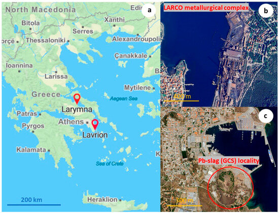 Primary lead slags in Lavrion historic mining area, located approximately 40 km southeast of Athens, were generated through the mining and metallurgical exploitation of the region’s Ag-Pb-Zn ore. These activities took place during the 19th and 20th centuries, and the produced slags are accumulated near the town of Lavrion and its harbor in land sites and seawater environment (Figure 2a–c). Slags from the “Greek Company” (GCS) originated from the re-smelting of ancient slags, which were primarily produced during the 5th and 4th centuries BC. GCS were deposited approximately 1 km south of Lavrion, covering an area of 90,000 m2 (Figure 1c). Slags from the “French Company” (FCS) resulted from the pyrometallurgical processing of Pb-Zn-rich concentrates, carried out from the late 19th century until the 1970s. FCSs were deposited approximately 1.5 km north of Lavrion, currently covering an area of 110,000 m2. The reductive smelting of ancient slags and Pb-Zn concentrates was carried out in Castilian-type blast furnaces and water-jacket furnaces, respectively. The slags were cooled slowly in the atmosphere. As of the late 1990s, the total quantity of GCSs and FCSs was estimated at approximately 7 million tonnes [36]; however, a significant portion of this material has since been utilized as aggregate in road and port construction.