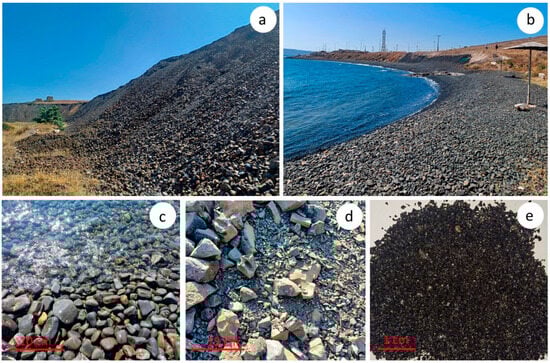 GCS dumps in Lavrion area: (a) FCSs on a coastline; (b) weathered/rounded FCSs from the interaction with seawater; (c) GCS ranging in size from a few millimeters to several centimeters; (d) and water-quenched FNSs (e).