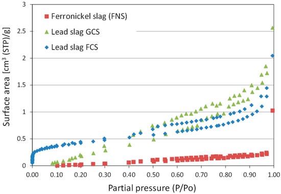 BET adsorption isotherms of ferronickel and lead slags.