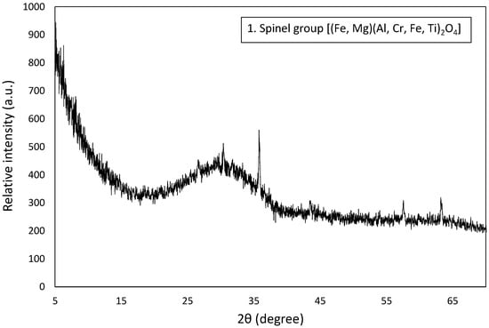 The solid phase composition of the ferronickel slag was revealed through x-ray diffractometry and scanning electron microscopy. FNS is a mainly an amorphous (glassy) material, and only a multi-element (Mg-Cr-Al-Ti) spinel-type was identified as the crystalline phase (Figure 5). Scanning electron microscopy further revealed the presence of isolated non-separated, through the reductive smelting step, Fe-Ni alloy droplets. The size of both spinel and Fe-Ni phases ranged from few μm to 300 μm. Energy-dispersive spectroscopy analyses indicate that the chromium content in the spinel was elevated (Cr2O3 exceeds 37 wt.%). The nickel concentration in the Fe-Ni droplets was in the range of 17 wt.%, while other trace elements such as cobalt and chromium were not identified (Figure 6). The approximate chemical composition (wt.%) of the amorphous phase, based on the average of several EDS analyses, was as follows: SiO2 = 45.0, Fe2O3 = 26.2, CaO = 9.9, Al2O3 = 9.8, and MgO = 8.6.
