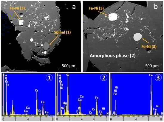 Scanning electron microscopy and representative energy dispersive spectroscopy analyses of FNS sample. The representative EDS analyses (1), (2) and (3) correspond to spinel, the amorphous phase and Fe-Ni, as shown in the micrographs.