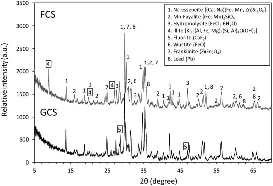 Primary lead slags, both GCS and FCS, exhibited a high degree of crystallization. Ca-Fe-/Fe-silicates, Zn-Fe-oxides and Fe-chlorides (esseneite, fayalite, franklinite, hydromolysite), and fluorite are the major crystalline phases. The main solid phase differences between GCS and FCS were as follows: (a) the presence of an additional illite phase in the FCS, and (b) the presence of fluorite and higher x-ray intensity in the GCS (Figure 7). The presence of the layer silicates (mainly illite) in the FCS is consistent with its microporosity, as revealed by the BET analysis. Metallic lead was scarcely observed, while Pb and Zn sulfides, as well as other secondarily formed phases, were not detected.